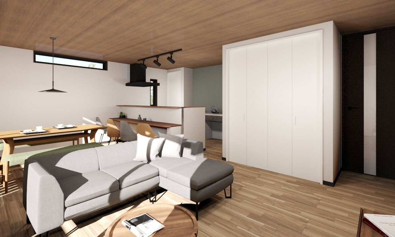 1階完結型のスマートな間取りは、普段は無駄なく穏やかに、週末には友人を招いてちょっとした料理を振る舞う。そんな生活スタイルを思い描く施主様のご要望に応えるもの。