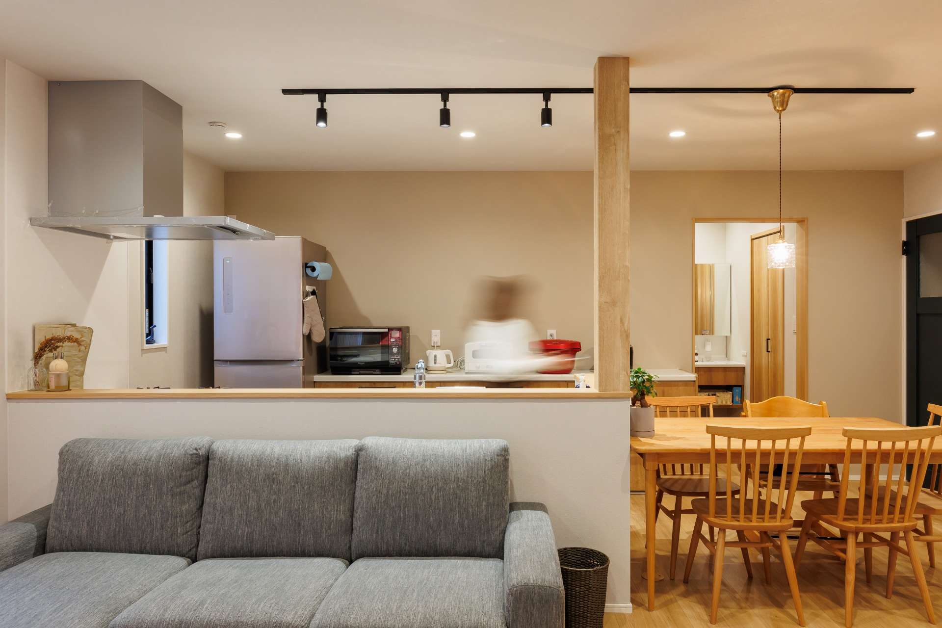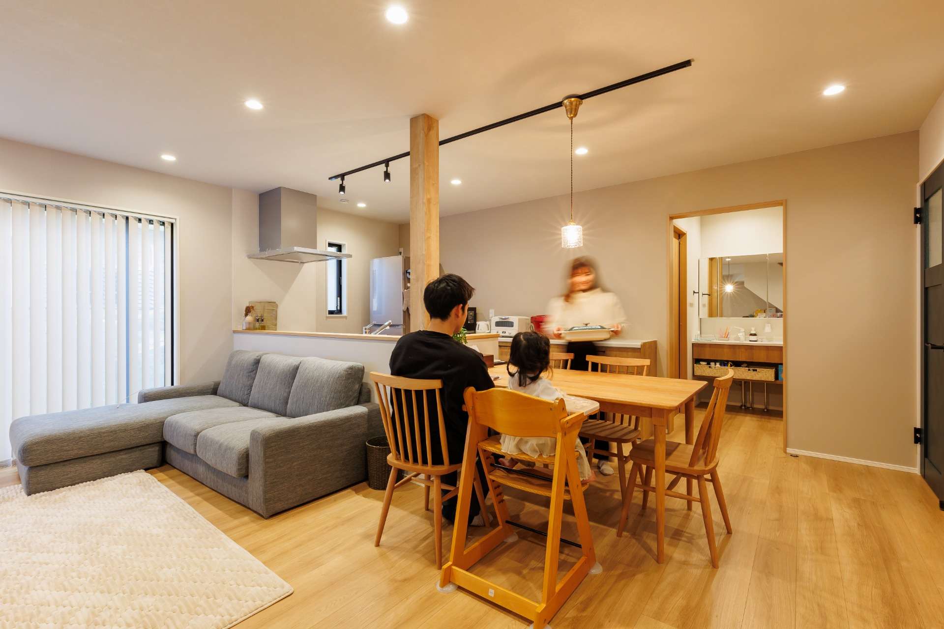 スペースをいっぱいに使ったナチュラルテイストなLDKは、ソファやダイニングなどの家具を置いても十分すぎる広さ。階段下も有効に活用できるようスペースを空けています。