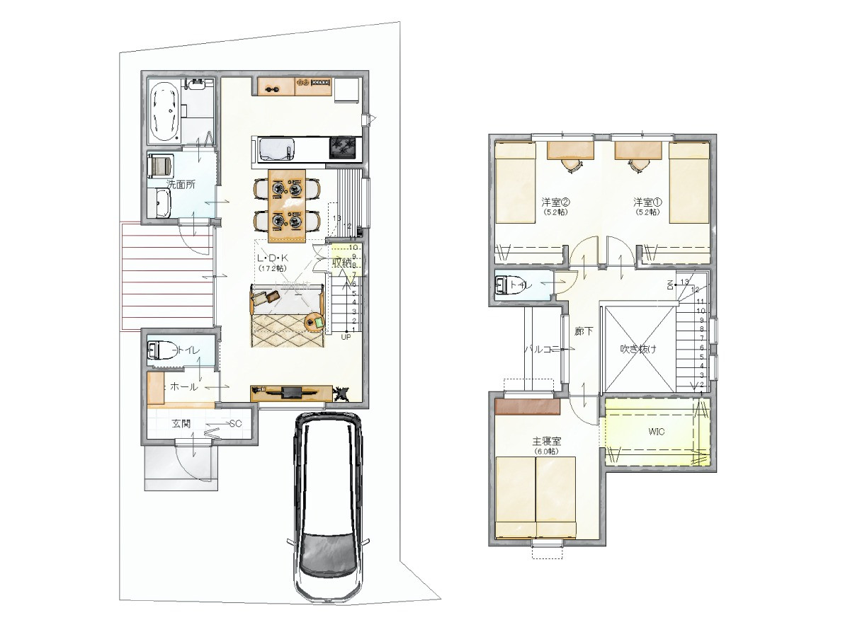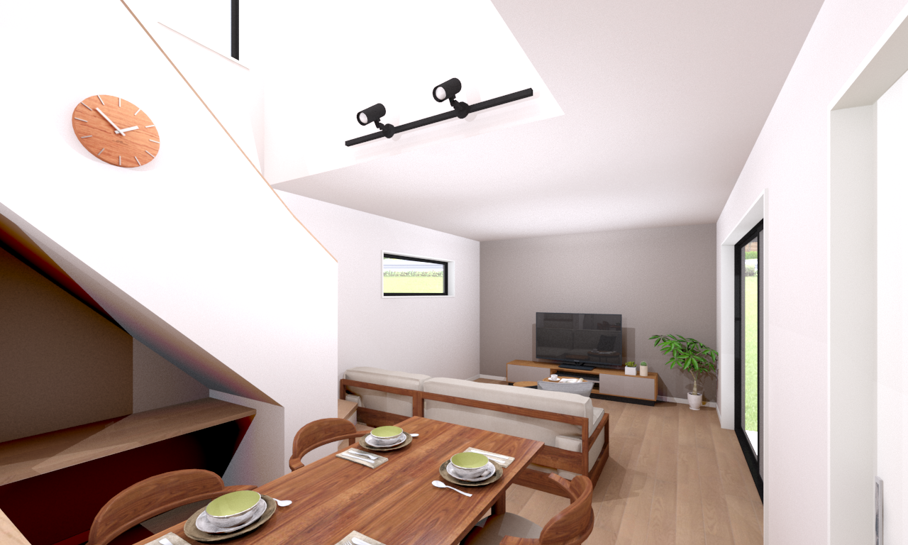 光を取り込む吹き抜けには、高窓だけでなく天窓も施工、自然光が家全体に降り注ぐ明るく鮮やかな生活をイメージ。無駄を減らして生活空間に還元する、高効率な間取りです。