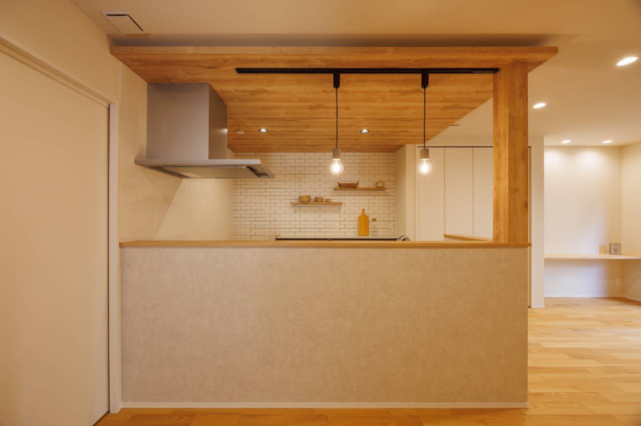 キッチンの下がり木目天井がアクセントになっているとても素敵な住宅。災害後でも、永く安心して住める家をコンセプトに性能レベルをあげて、お好みのナチュラルデザインハウスに仕上がりました。詳しい住宅ポイントは施工事例ページでご覧ください★
