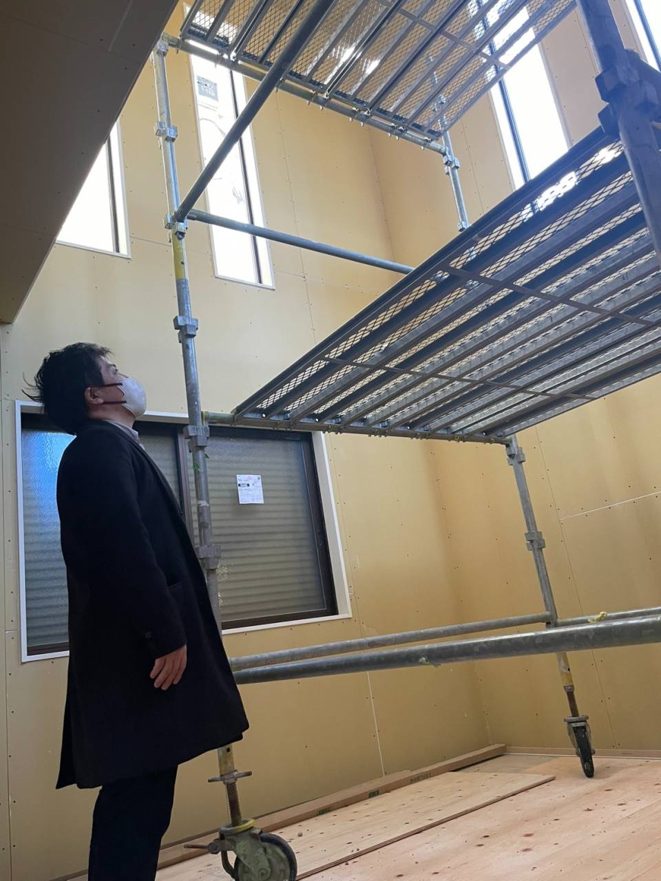 宮之阪の建売物件【TSUBAKI STYLE 宮之阪5丁目】は吹き抜けのある2階建て住宅です。壁紙施工のため足場がありますが、吹き抜けのサイズや採光についても確認することができます💞