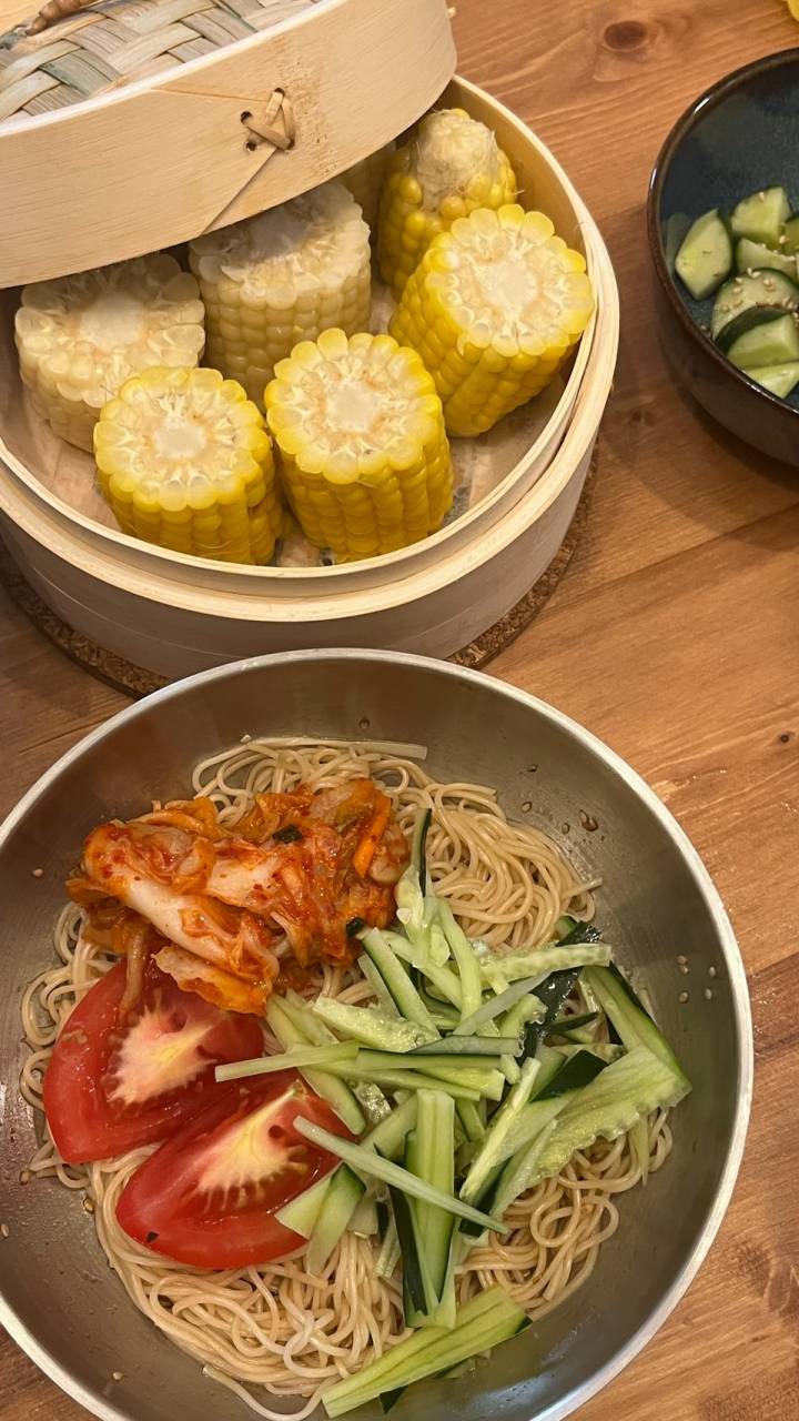 - 夏野菜は美味しい - 2025/07/20 - 夏野菜で夜ごはんの日 - こんにちは~~柳瀬です! 家庭菜園をやっている叔母から ありがたいことに野菜をいただき料理をした日の紹介です!! キムチとそうめん以外はいただいた野菜です~ とうもろこしはせいろにしていただきました😊 甘くておいしくて最高でした😋💛 ビビンそうめんは旦那さんが作ってくれました! やっぱり料理が上手ですね~~美味しい👏 8月にはイベントがあるので野菜をたくさん食べて 健康に過ごそうと思います!!!