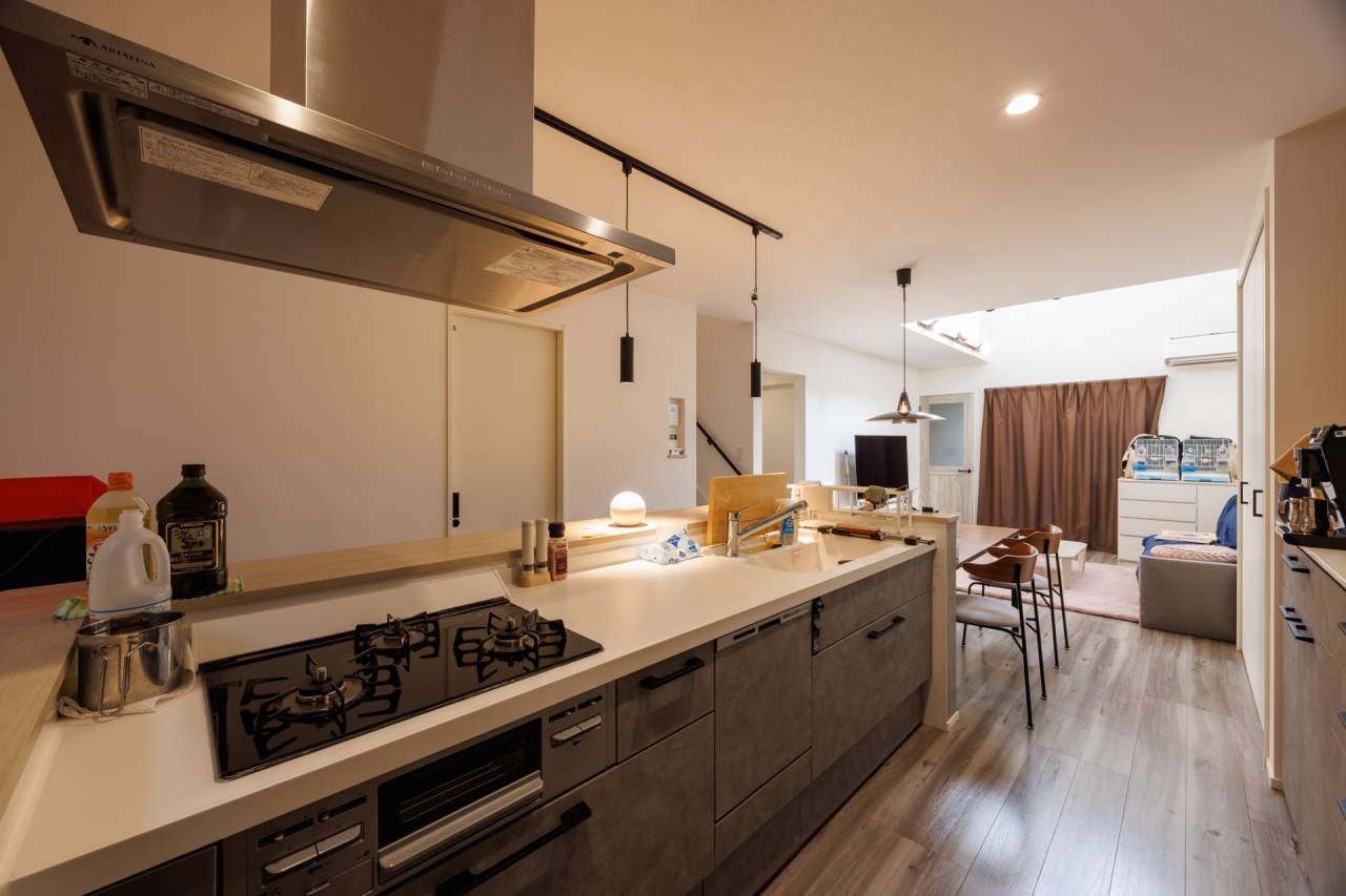弊社でも需要の多いキッチンダイニングの横並びレイアウト。距離が縮まることで、家事ラク・時短を図れます。また家族間の距離も近いので、有意義な家族との時間をとることができます✨