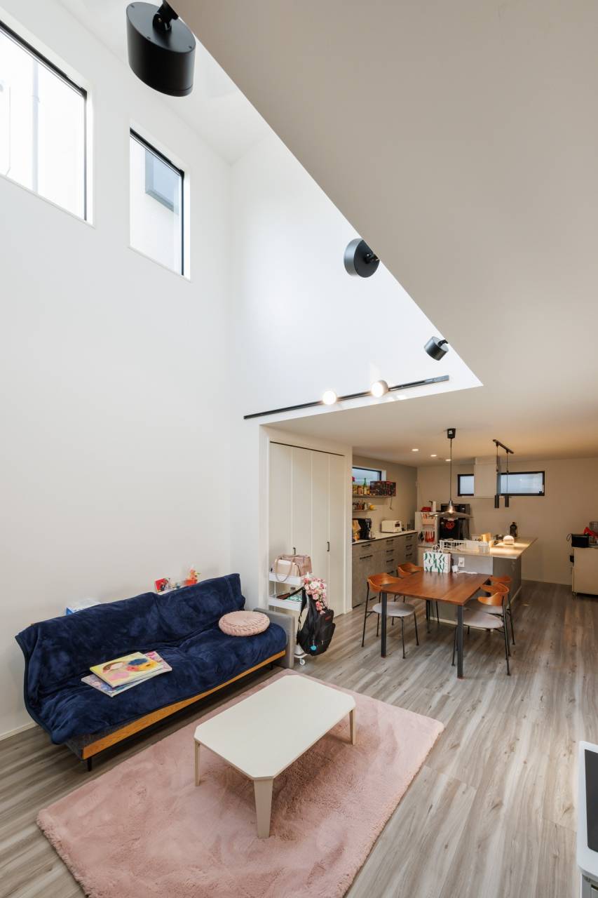 清々しく明るい吹き抜け空間は、ペットと暮らし、気持ちよく過ごせるお気に入りの場所💕吹き抜け部のスリット窓が、気持ちの良い光を注いでくれます。