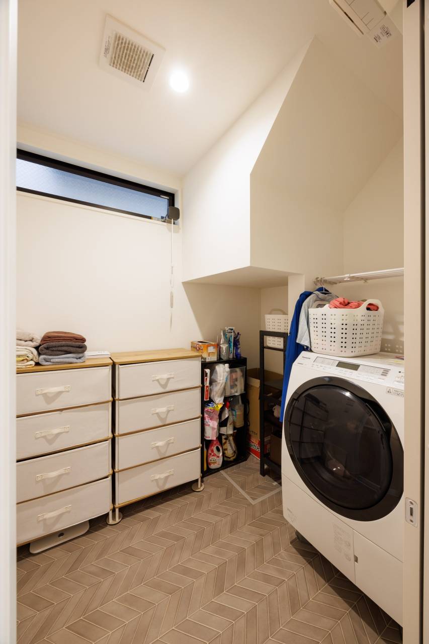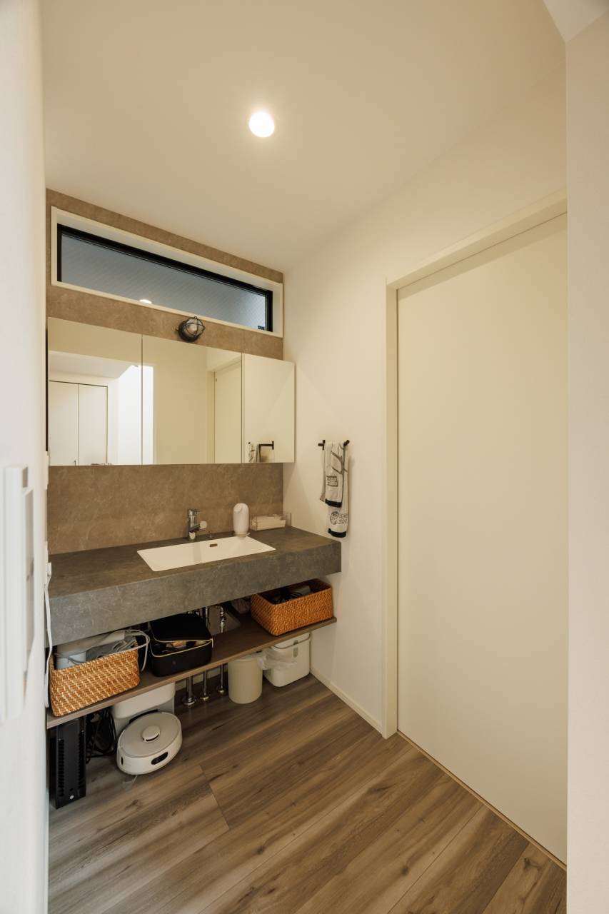 リビングからワンステップで行ける洗面や、脱衣スペースには自分たちが使いやすい工夫が施されています。室内空間を有効活用できるよう、家具の配置やインテリアを用い、整理整頓できるよう仕上げられています🙌