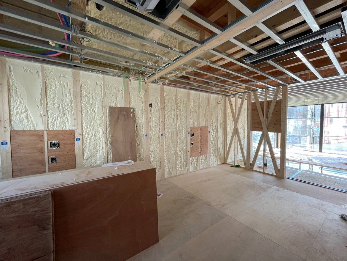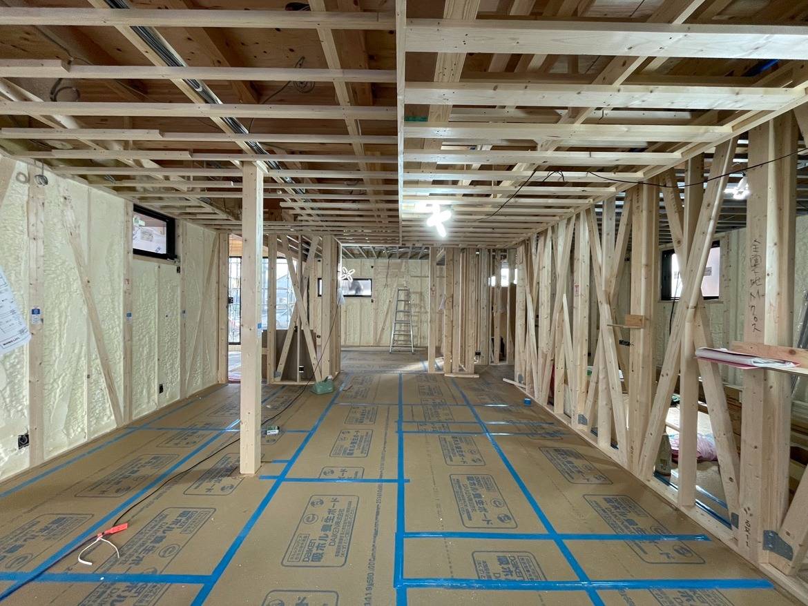 現在は、壁や天井の内側の工事が進んでいます。 断熱材が隙間なく敷き詰められ、電気配線が張り巡らされている状態です。紙ベースの図面だったものが形になっていくのを目にし、日に日に感動しています。ぜひ皆さまも、工事の進捗・完成をお楽しみに💕