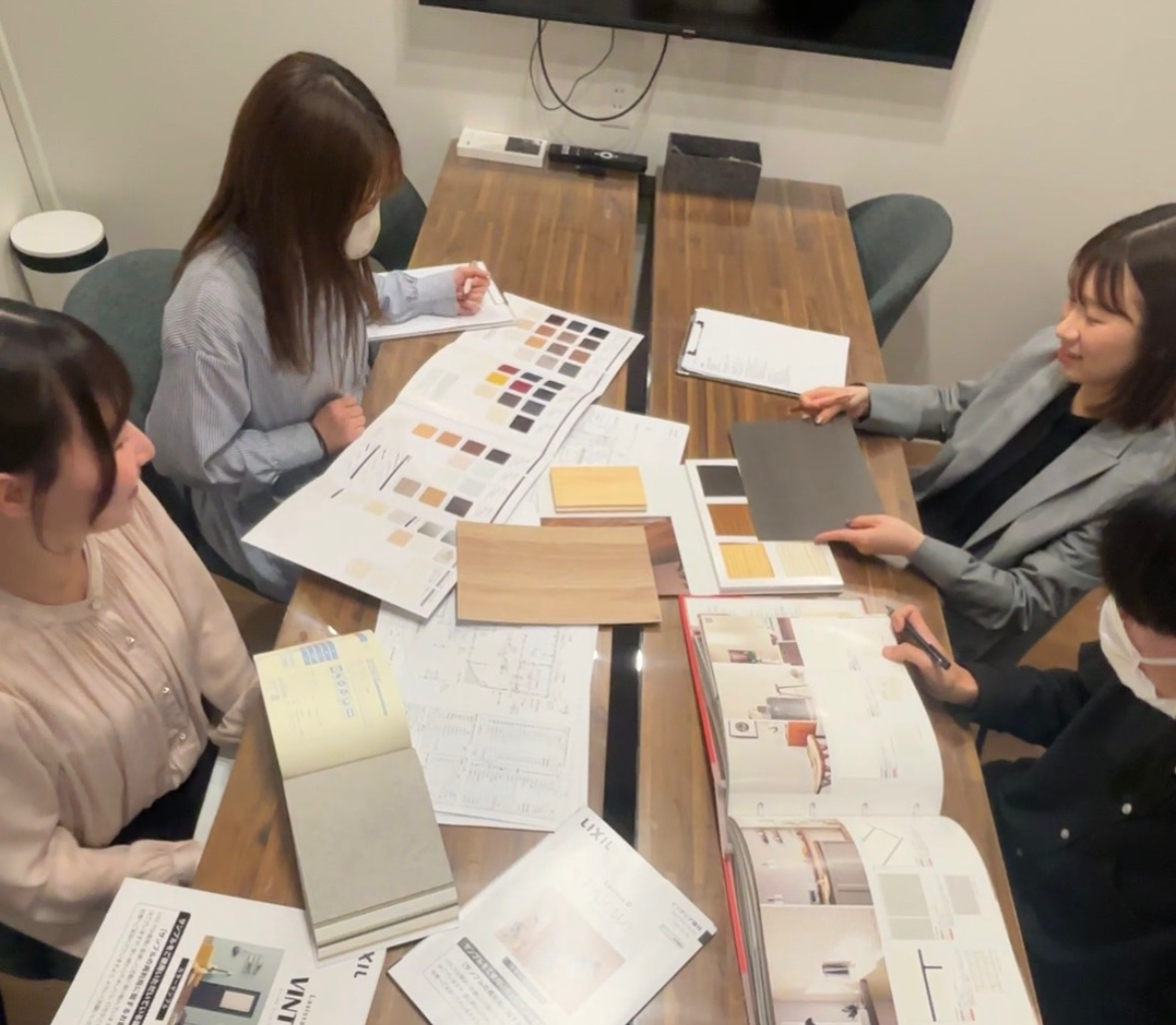 ショールームを兼ねた空間ですので、カタログだけでは伝わらない素材の質感や、空間の広がりを肌で感じながら、リラックスしてお話しいただけます👆