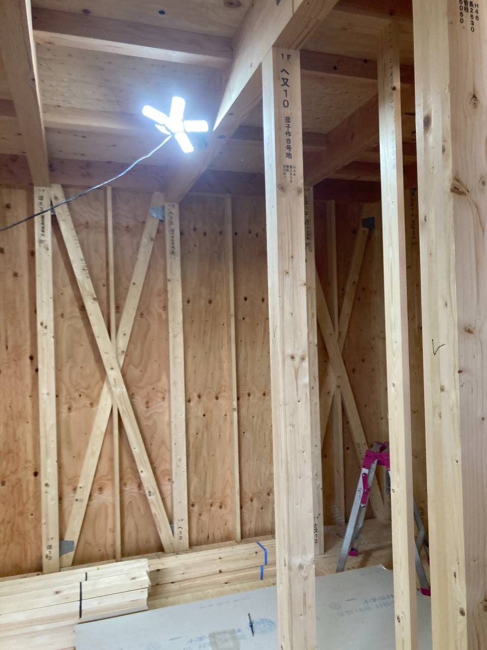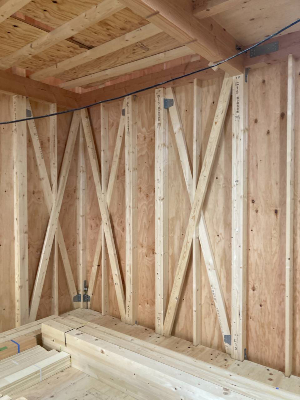 筋交いとは柱・梁・土台の四方組まれた中に斜めに入れる補強材です。 建物の強度に関わる重要なモノで、片側一方向だけの場合と「X」に入れるダブルの場合があります👆