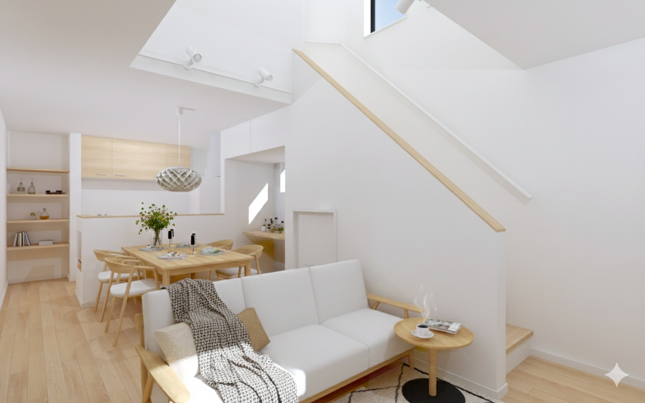 一歩足を踏み入れると、そこには外観のクールな印象とはまた違う、温もりあふれる世界が広がります。内装の主役は「ナチュラルオーク」の柔らかな質感。 床や建具に取り入れた木の風合いが、空間全体に安らぎを与えています。さらに、リビングは贅沢な吹き抜け設計! 高い窓から差し込む陽光がリビングの隅々まで届き、家族が集まる場所を明るく、開放感たっぷりに包み込みます☝️(画像は3Dパースです)