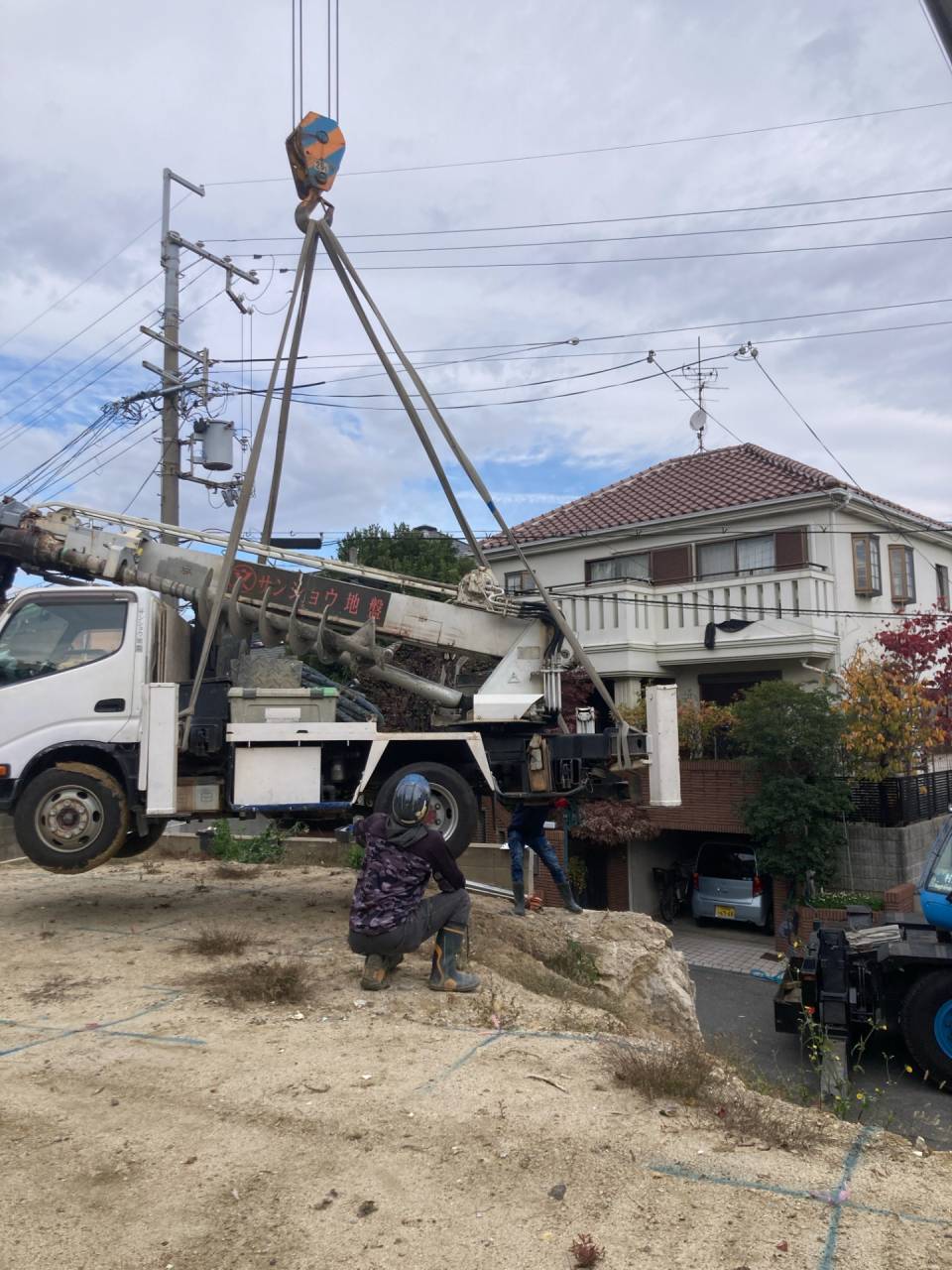 改良工事にも複数の方法があります。今回は柱状改良という地中にコンクリートの杭を多数つくる工法です。道路から高低差があり、車がが侵入できないため、レッカーで車を持ち上げて施工しました。⇩なかなか見ない光景です(笑)。